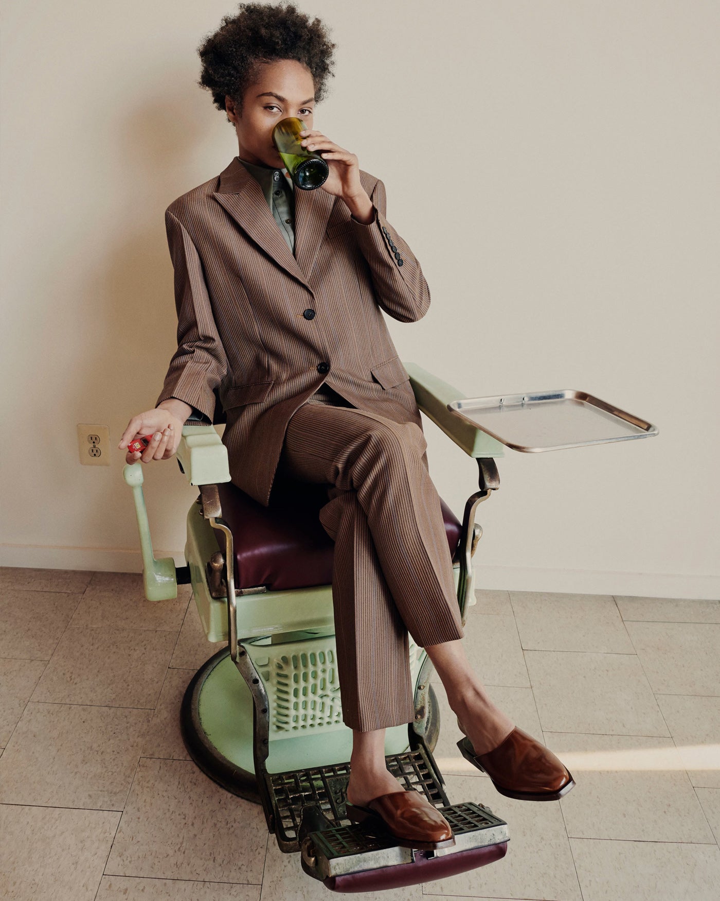 - Wide-dropped shoulder tailored blazer / Stripped brown